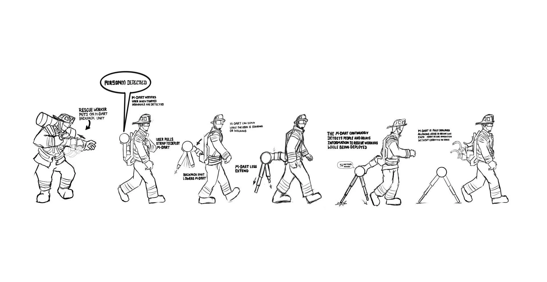 Rescue workers wear the M-DART on a backpack rig so that they can deploy while on the move